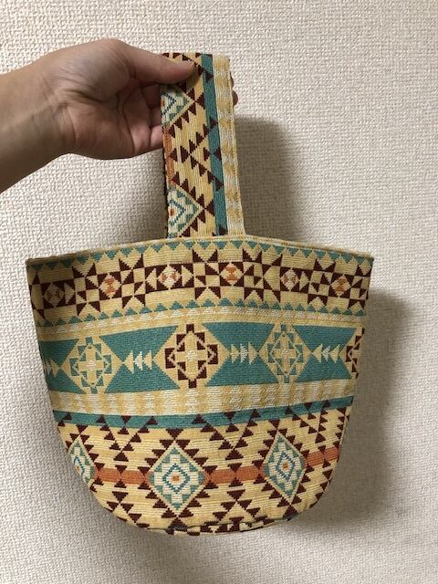 1つ1つ手作業で作成しましたオリジナルハンドメイドです。シンプルなお洋服に合わせてもアクセントになる色柄で、丸マチで中身も見やすく出し入れやすい、お出かけに便利なサイズになっております。